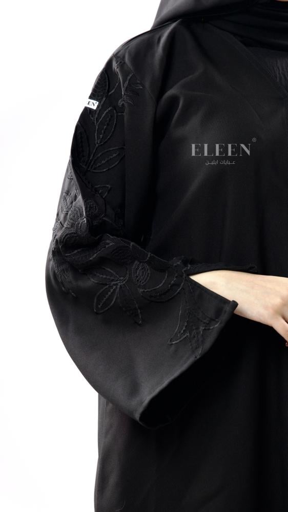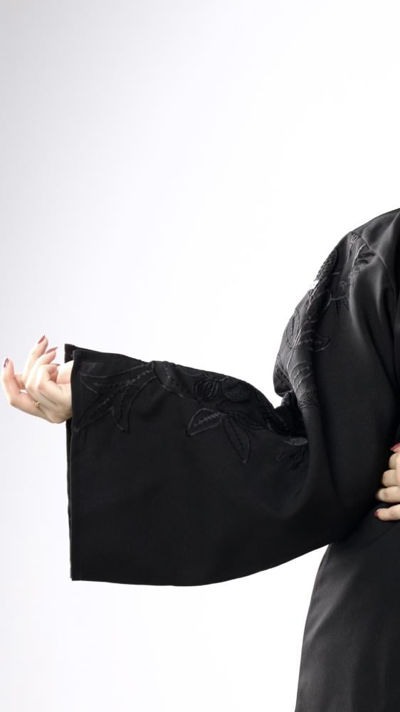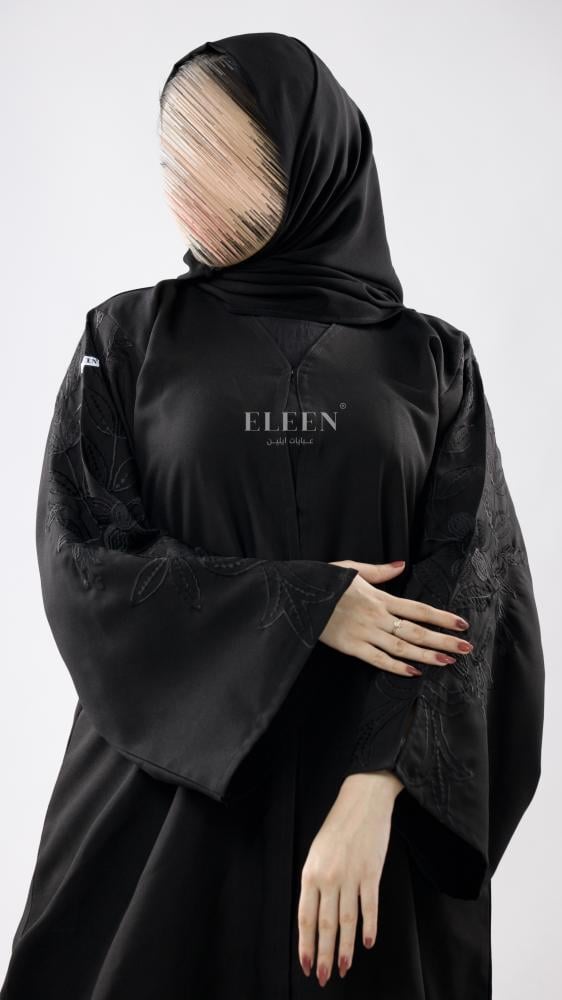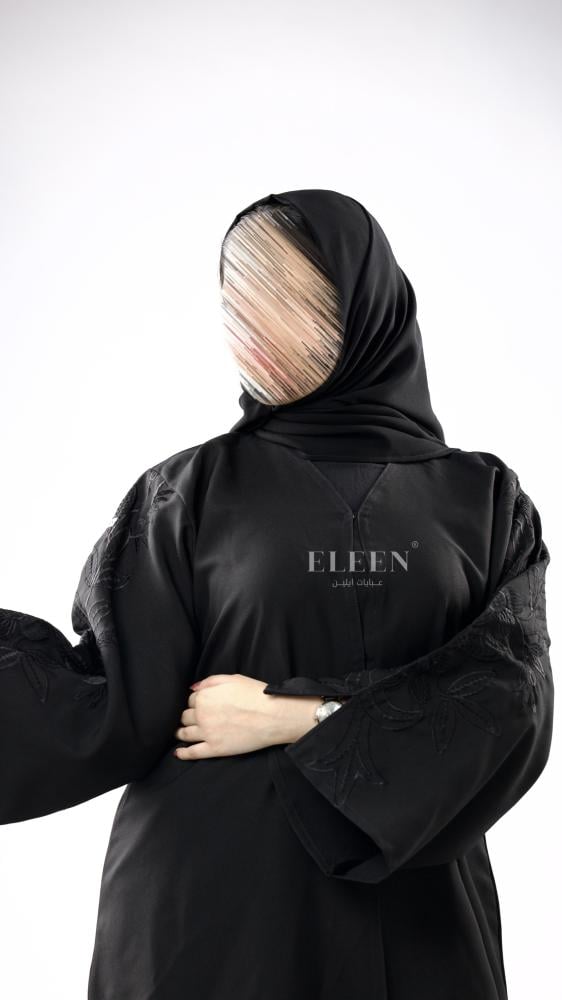- العباية قصتها ربع كلوش بقماش كتان الواقف الكوري اسود فاحم جدا مع تطريز باللون الاسود على الاكمام لتعطي العباية رقة وجاذبية اكبر للعباية مع فتحة بسيطه في طرف الكم