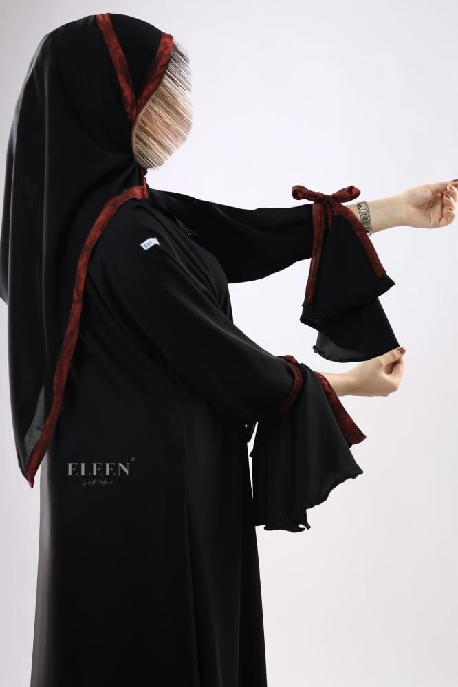 - العباية قصتها نصف كلوش بقماش نواعم الكوري سوادها فاحم جدا مع تداخل شيفون احمر على هيئة فيونكة في الكم
